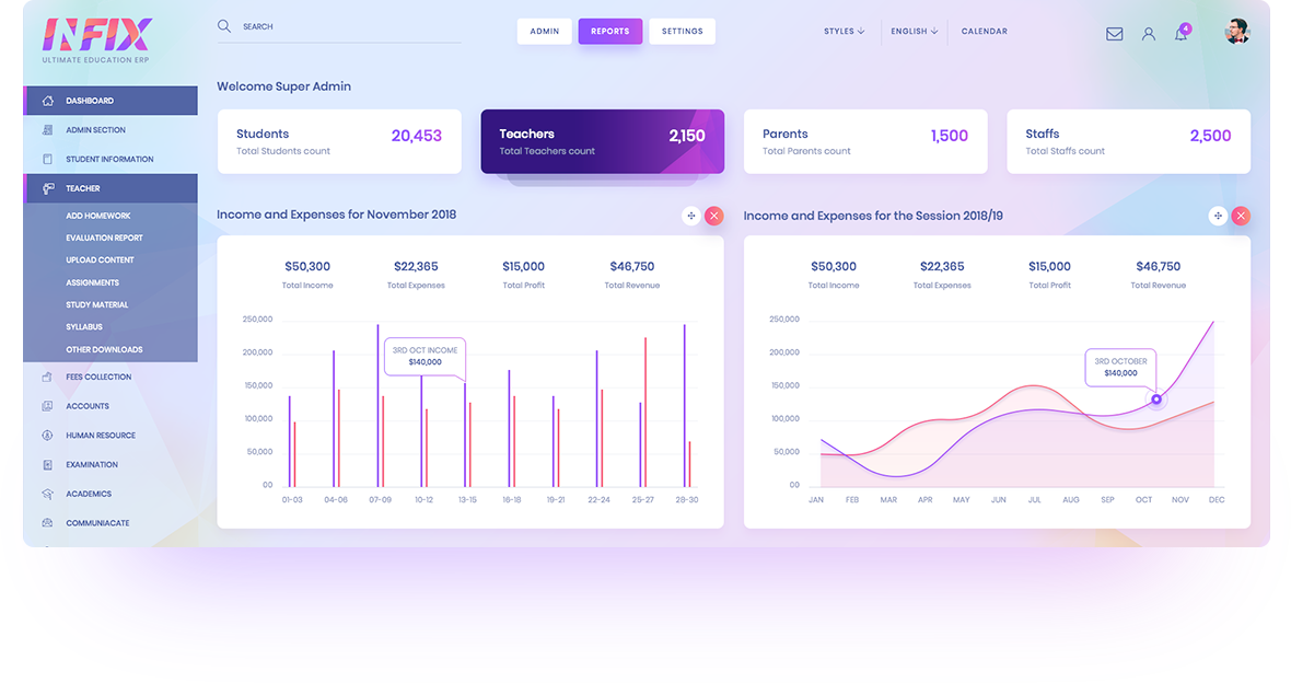 Class reports, student’s reports, Progress card, Attendant reports and many more.